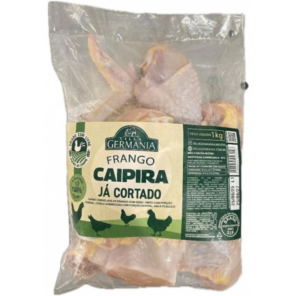 CARNES E AVES>FRANGO CAIPIRA>FRANGO CAIPIRA INTEIRO COM MIUDOS>FRANGO CAIPIRA CORTADO CONG VILLA GERMANIA 1KG (CX 12KG)